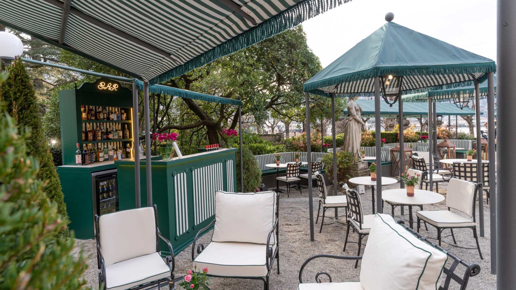 The experience of la dolce vita on Lake Como, a cocktail en plein air in the charming café nestled in the lush garden overlooking Como’s ancient dock and lakefront.